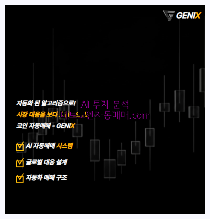 코인 코인자동거래와 AI 코인자동거래를 고민하고 있다면 지닉스 스마트 거래 시스템 GENIX를 통해 직접 경험해보시기 바랍니다. 텔레그램 1:1 문의 : genix_trading