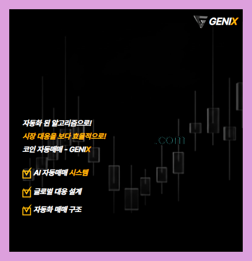GENIX 자동매매 GENIX는 기존 알봇 ALBOT을 전면 리뉴얼하여 탄생한 AI 기반 코인 코인AI거래 플랫폼입니다. GENIX 자동매매는 안정적인 수익을 내는 것을 목표로 하고 있으며, 현재 글로벌 코인 코인AI거래 솔루션으로 운영중입니다.